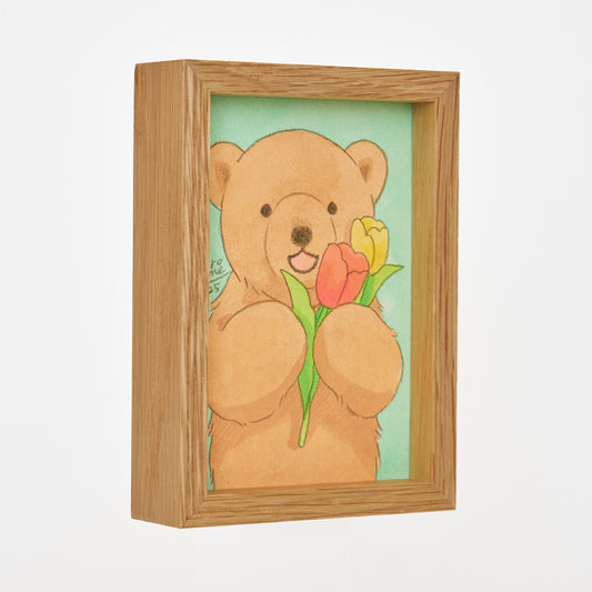 デスクや棚にも飾りやすいコンパクトさ。自立式のフレームに入れてお届けします。