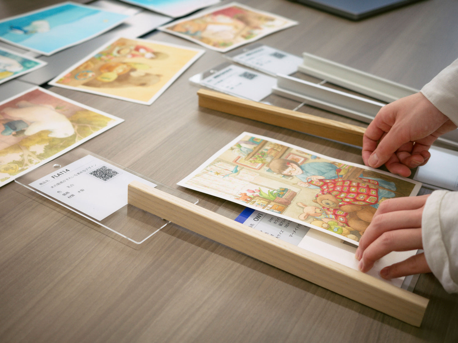 額縁メーカーのショールームに赴いて、しろさめ自身が作品に合う色と素材を3つ選びました。全ての作品でその3種類をお選びいただけます。