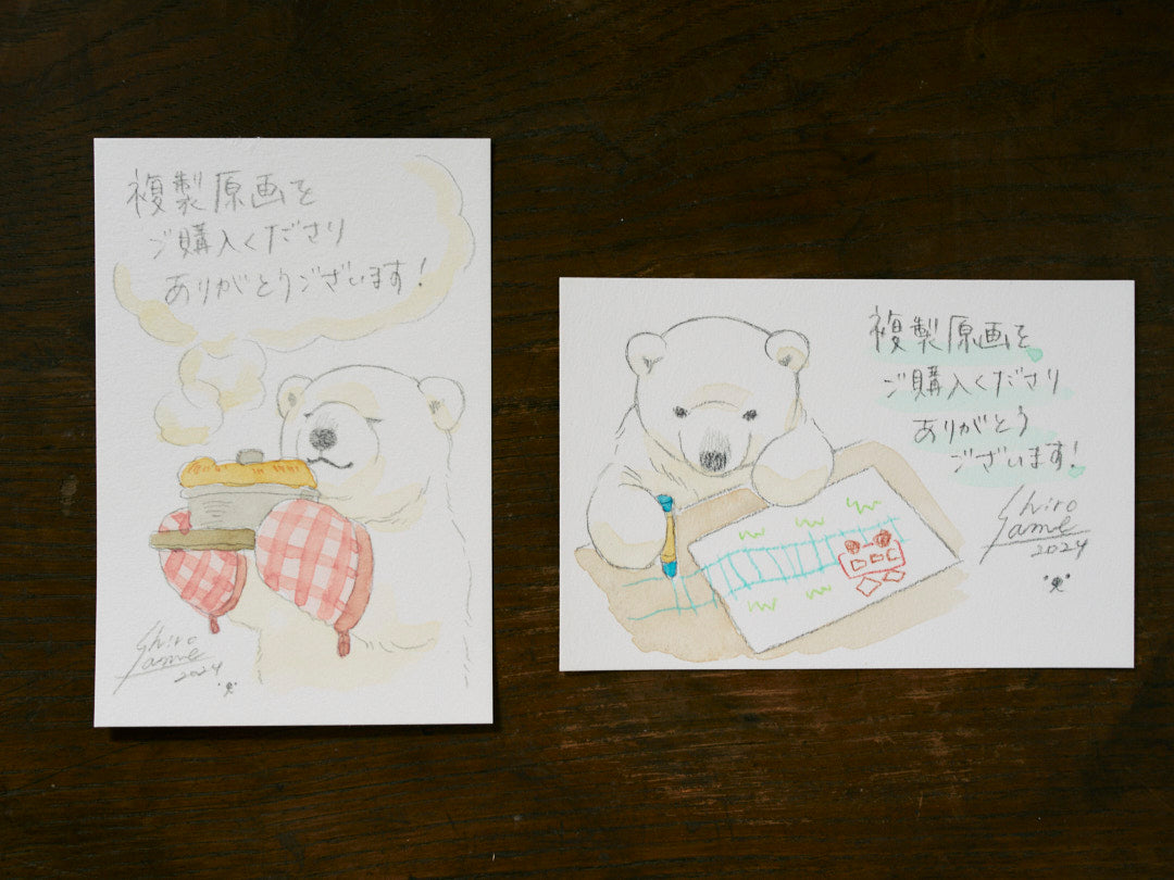 複製原画をお届けする際に、しろさめが描いたポストカードサイズのサンクスレター=”ミニ原画”を同封します。このサンクスレターは「複製原画のみ」のご注文も対象です。